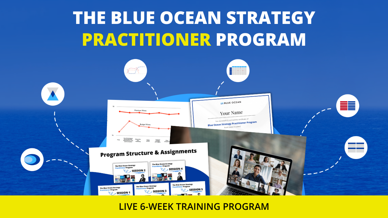Join our 6-week hybrid experiential learning program guided by a seasoned Blue Ocean Strategy Expert. Apply the blue ocean strategy process to your business during the program and unlock new growth opportunities.
